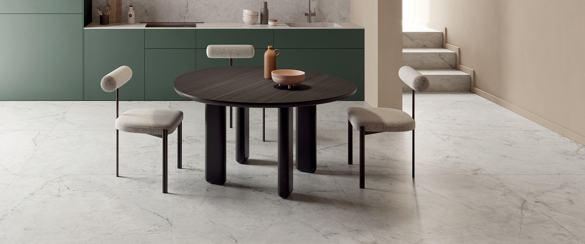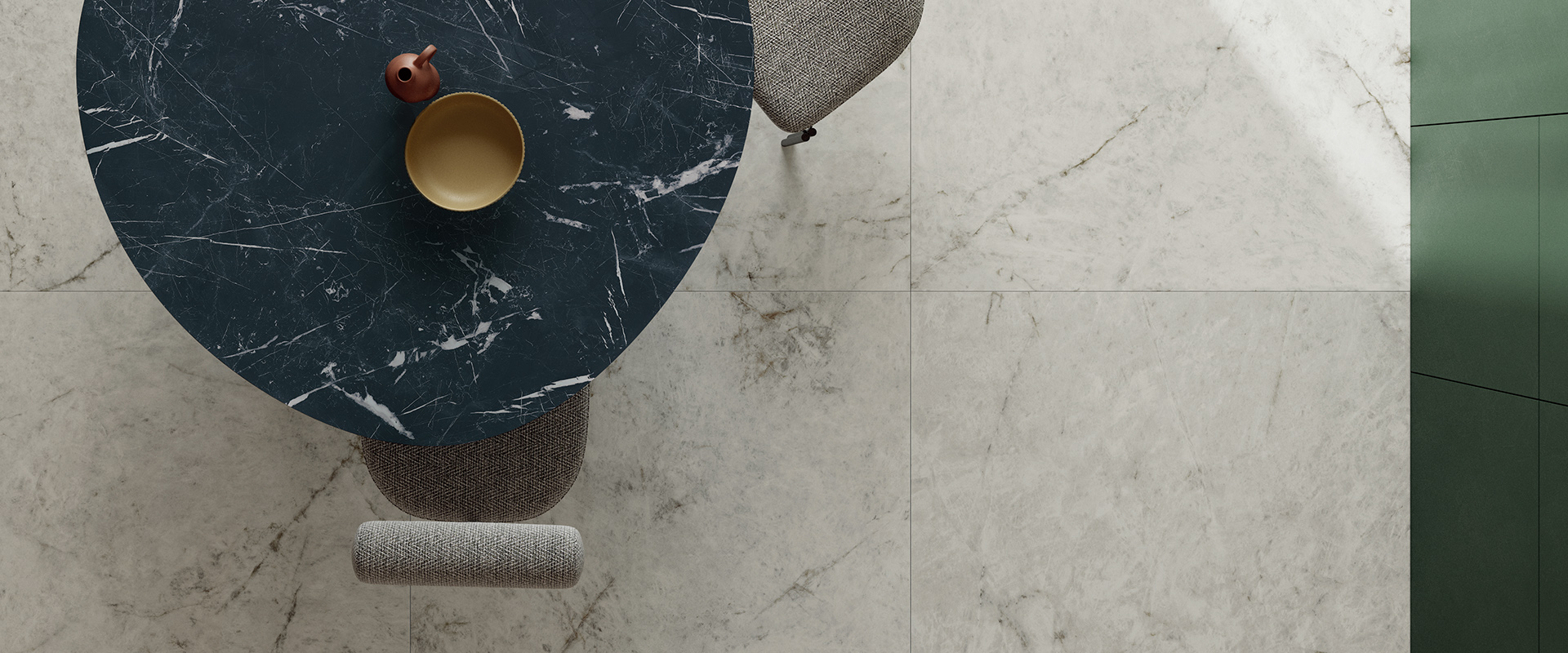 靈感源於巴西的一種石英岩、擁有白色而剔透似冰的底色與深色脈絡。表面的結晶與大地脈絡般的深色紋理