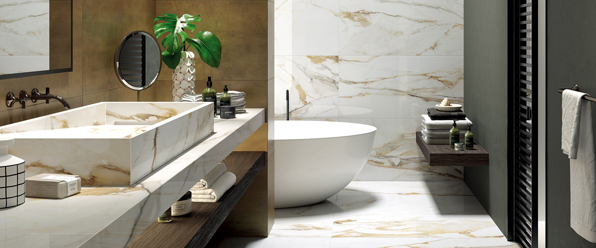 是一種極簡、極具現代感的設計,但又不失優雅和藝術感。白色大理石基底為空間帶來了純粹和高雅的氛圍,而金黃色瀑布紋理的加入則為空間注入了一股自然、生命力和溫暖感。
