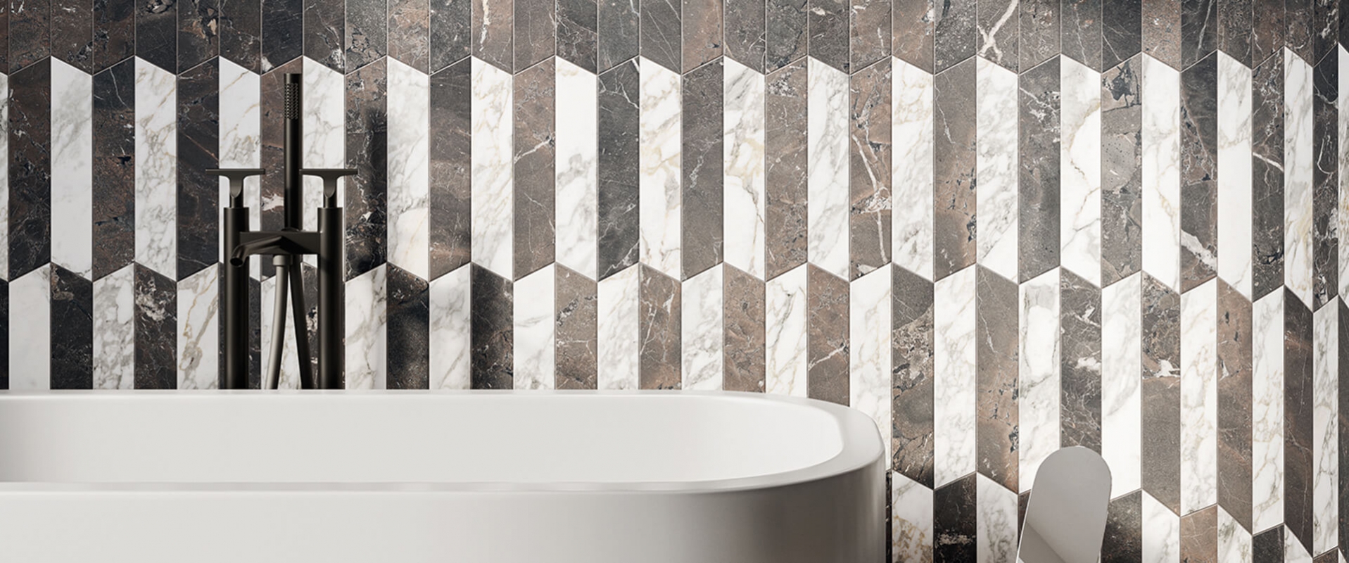 金色紋理如岩石中的金色光芒,吸引目光;灰色脈絡則營造穩重踏實的格調。不僅尺寸豐富多元,7.5X40.7的尺寸更可與其他紋理相融合,呈現出無限可能的設計風格。