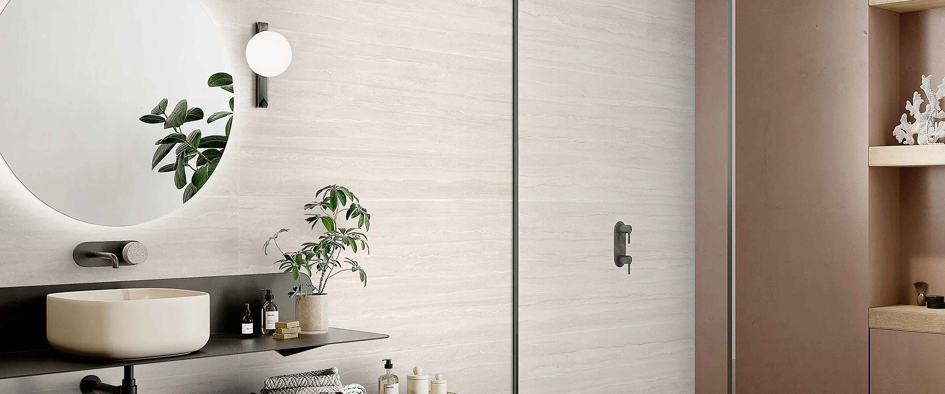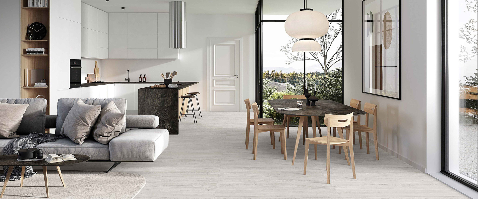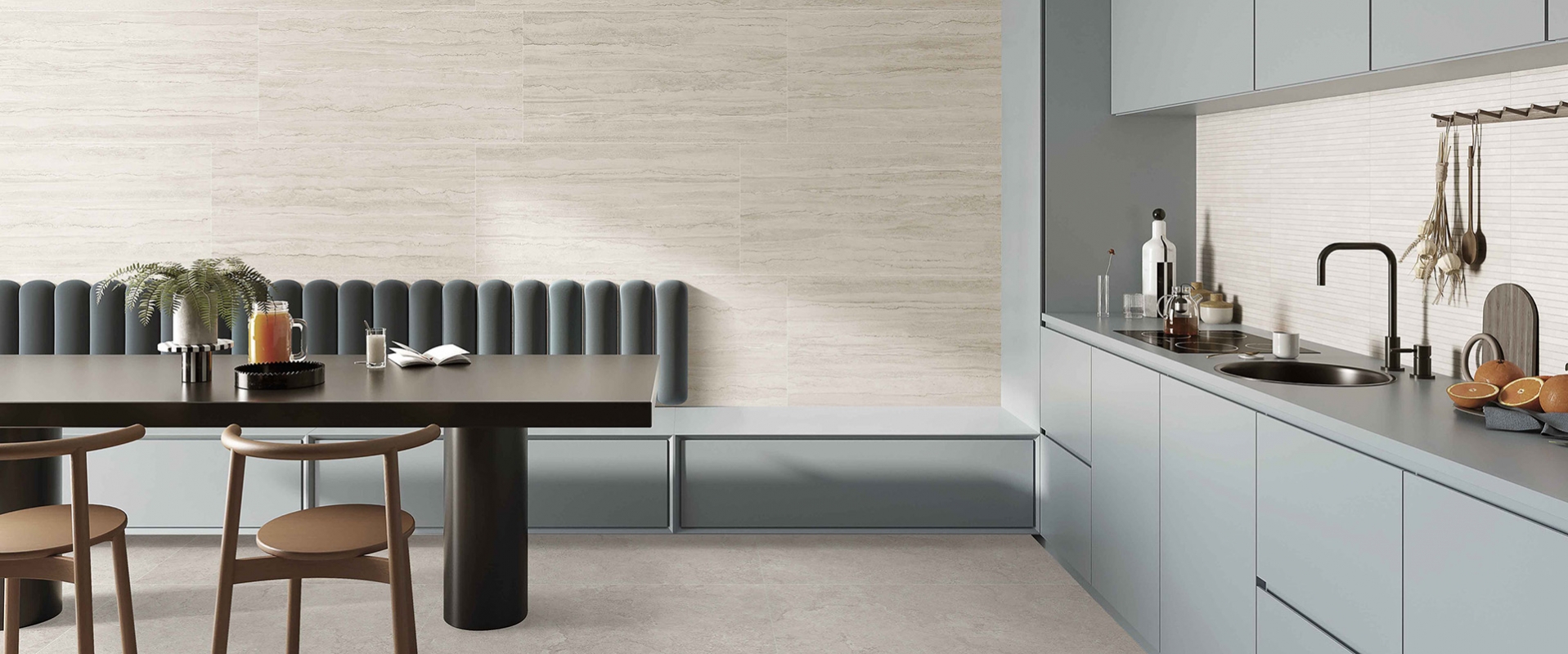 白、米、淺灰三大基調,宛如陽光灑落石壁時的光影變化,低調中蘊藏著高雅與深度,每一片磚面皆呈現獨特的紋理走向與礦物肌理,不同模面讓鋪陳效果更貼近天然石材的真實面貌,觸感溫潤、色彩柔和,既保留了石材的自然厚度,也賦予空間靈動的視覺層次。
