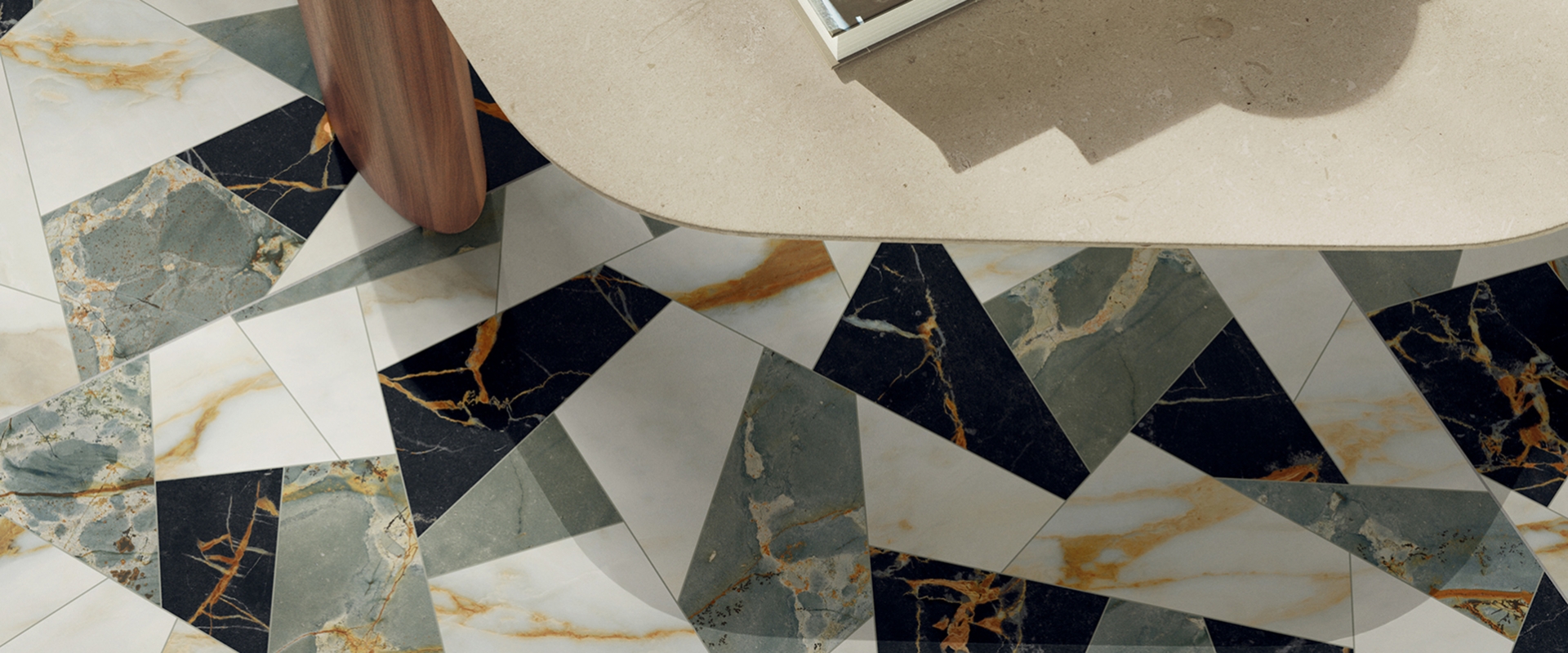 璀璨羅馬其華麗的紋理與層次豐富的色澤堆疊成灰藍色系的大理石紋理;黑金碎浪特有的金色紋理與靜謐的黑色基底形成美麗的對比,