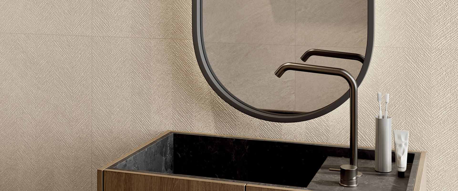 微噴砂工藝帶來如絲絨般溫潤的觸感,指尖掠過,是自然細語般的回應。那一層層起伏,不為張揚,而是為空間留下一段可被感受的靜謐,讓磁磚褪去冷硬,化作貼近生活、貼近大地的自然表情。