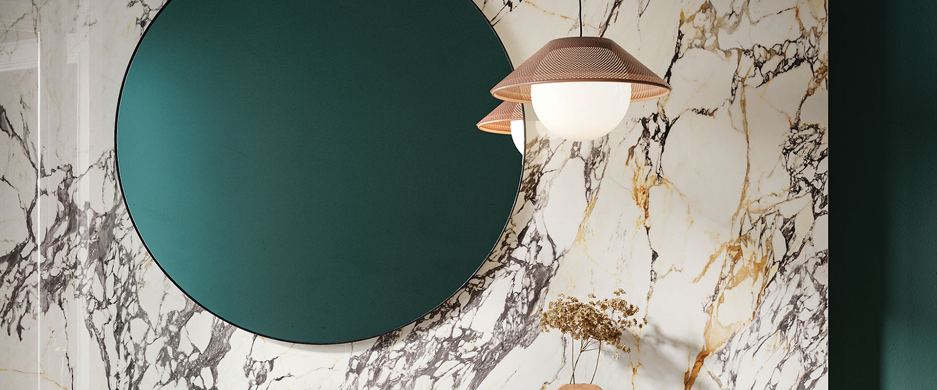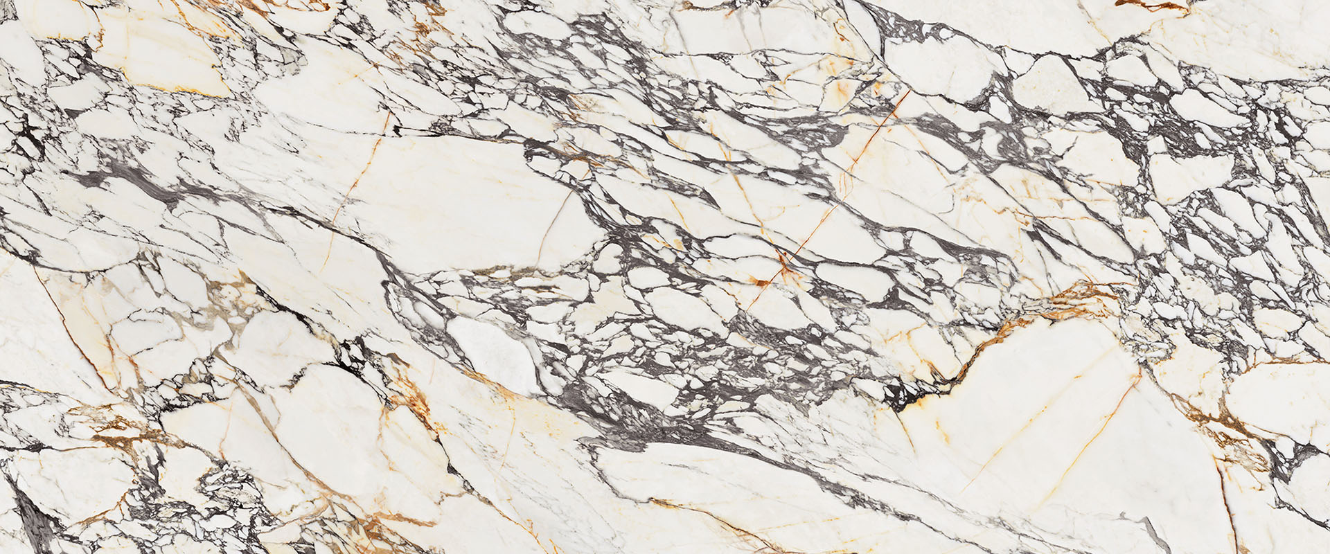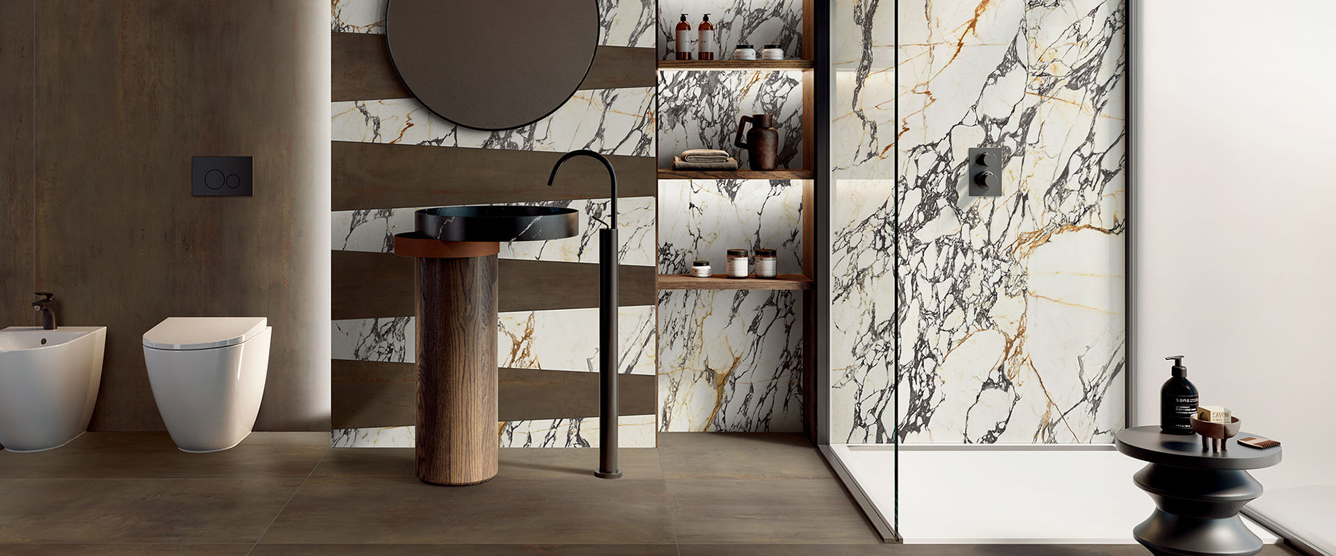 由於其高度的色彩對比,Breccia Capraia與相應而生的科奇亞流金系列賦予空間華麗的視覺效果與絢爛的時尚美感
