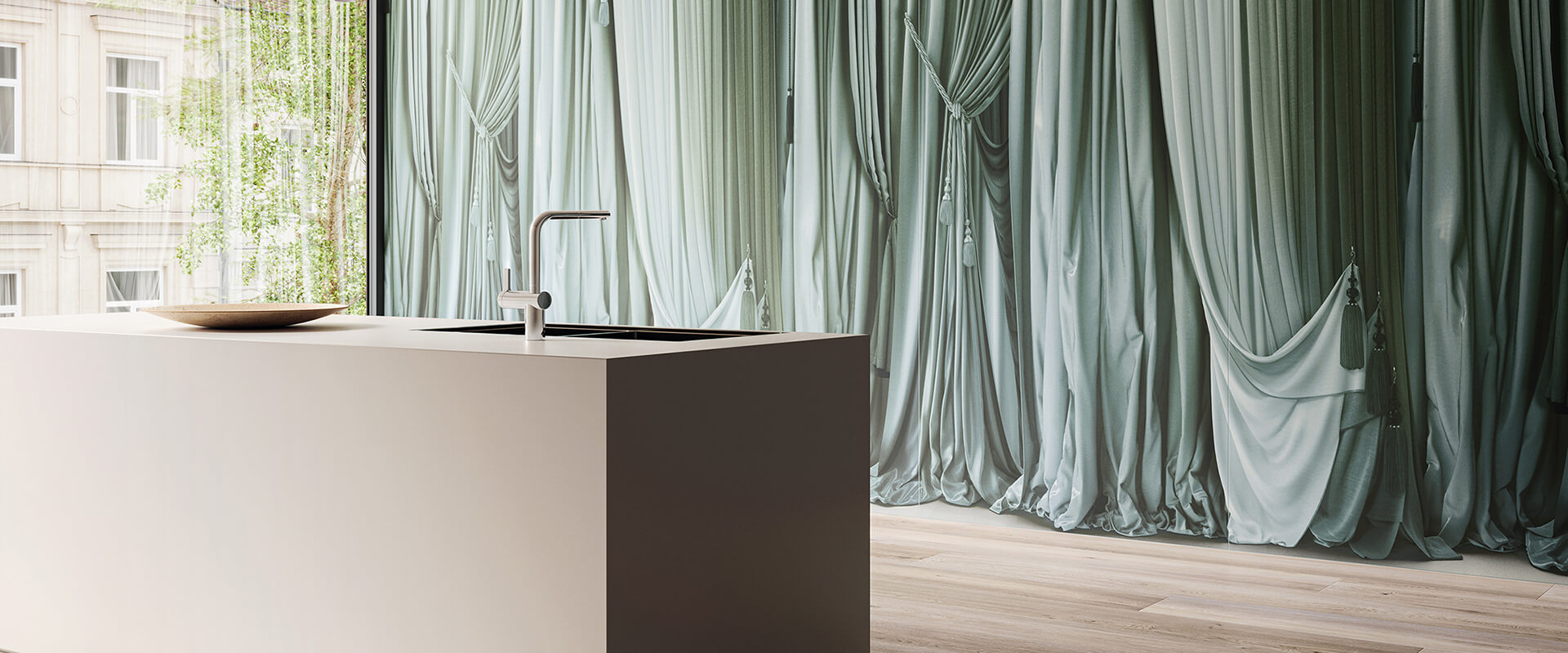 帷幕的設計靈感主要來自於自然界的柔美曲線和家居生活中的溫馨場景。將窗簾隨風飄動的美妙姿態定格在磁磚上,隨著人們對居住環境要求的不斷提高,