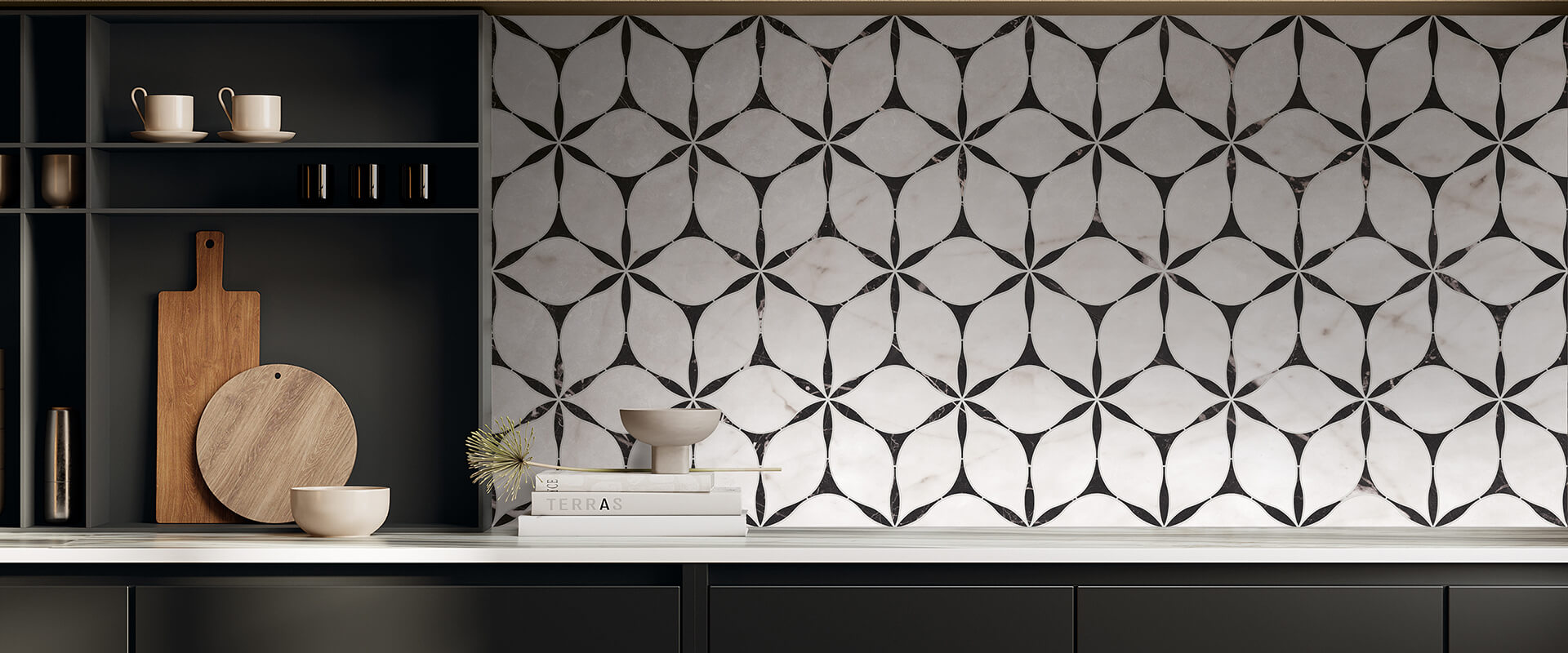 以黑色大理石為基底,鑲嵌著白色大理石的花瓣,展現出一種絕美的黑白對比,如同冰霜下的花朵,以傲然姿態綻放,散發著冰清玉潔的氣息。帶來一股清冷而高雅的氛圍。