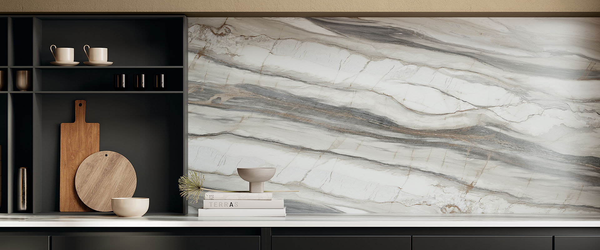 這款面材的紋理粗獷而有力,它具有複雜的斑駁紋路,混合了明亮的白色底色和淺灰色和深灰色調,展現出獨特的個性和風格