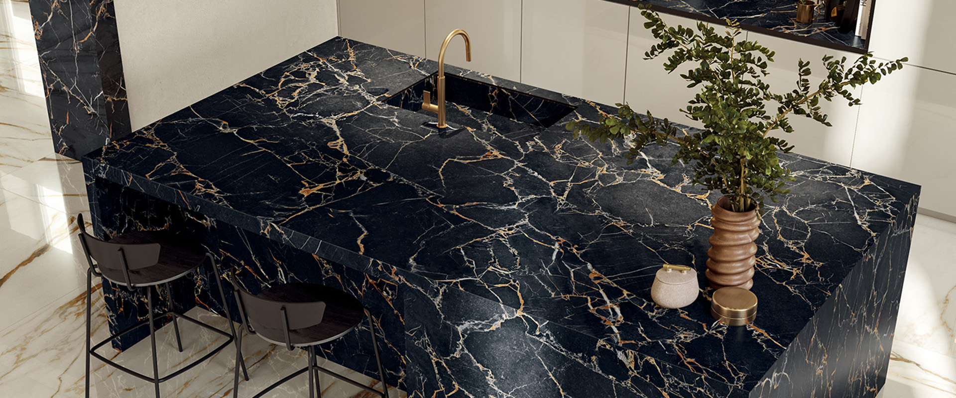 其優雅、特有的金色紋理與靜謐的黑色基底形成美麗的對比,有如在月光下打上維內雷港金色浪花