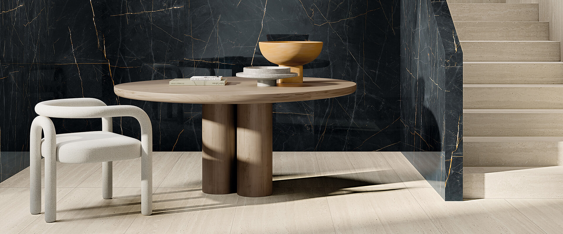 靈感來自位於義大利羅馬拿佛納廣場,以巴洛克風格建築令人著迷,來自大自然鬼斧神工的洞石紋理,詮釋歷史文化的魅力,每一個細緻孔洞都凝聚了對大自然深刻的敬意,散發著一種原始而迷人的美感。