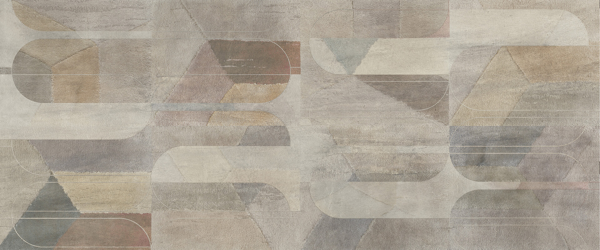 以抽象幾何與質感層疊,構築出一面充滿秩序與詩意的立面。柔和的灰、米、卡其與淡藍色塊錯落交織,彷彿是空間中不同材質、光影與時間的沉積。